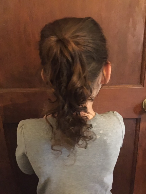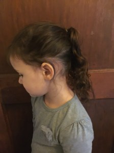 Being that Pixie has such curly hair, her hair often looks a lot shorter than it really is.  You wet that head and her hair goes down between her shoulder blades, but once it dries, it’s more like a bob.  Regardless, I’d kill for her curls.  Typically, her ponty tails are tiny, curly and adorable.  I’ve actually had people ask if I curl her hair.  I should have really taken a picture of a typical Pixie pony so I could show you, but I’m a terrible blogger and who has forethought these days?